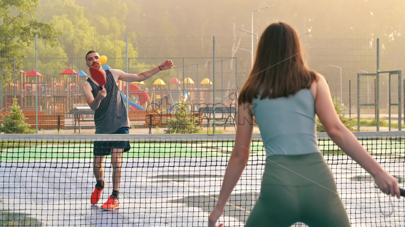 VIDEO A man and a woman playing pickleball at sunrise, after rain Royalty Free Stock Video Footage