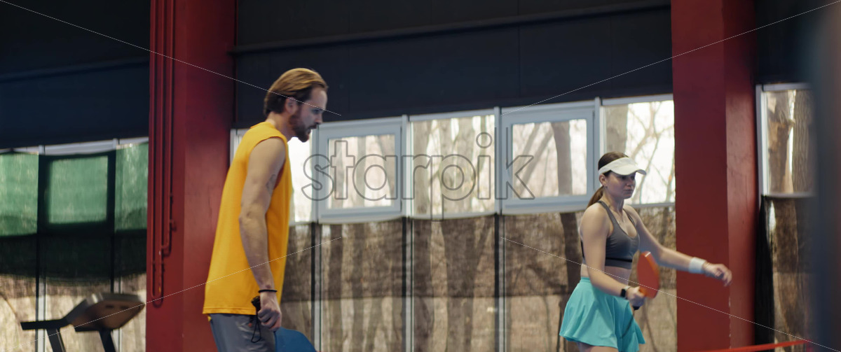 Video A man and a woman training to play pickleball on a blue, inside court Royalty Free Stock Video Footage
