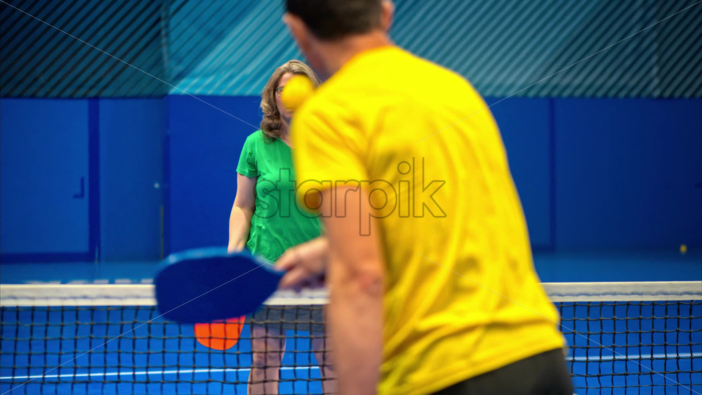 Video A man and a woman playing pickleball on a blue, inside court Royalty Free Stock Video Footage