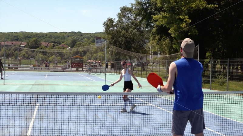 VIDEO A man and a woman playing pickleball on a sunny day Royalty Free Stock Video Footage