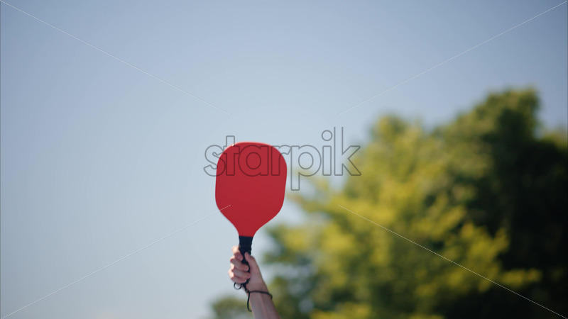 VIDEO Close up of a man in a blue shirt playing pickleball with a red racket on a sunny day Royalty Free Stock Video Footage