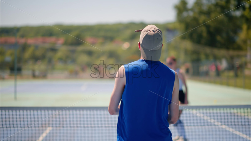 VIDEO A man and a woman playing pickleball on a sunny day Royalty Free Stock Video Footage