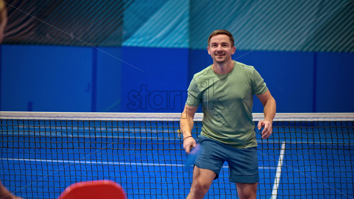 Video A man and a woman playing pickleball on a blue, inside court Royalty Free Stock Video Footage