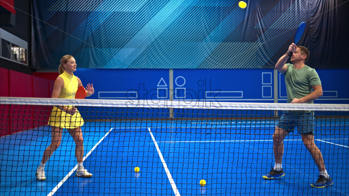 Video A man and a woman playing pickleball on a blue, inside court Royalty Free Stock Video Footage