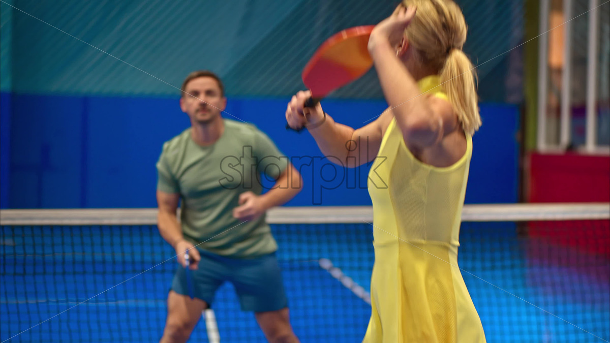 Video A man and a woman playing pickleball on a blue, inside court Royalty Free Stock Video Footage