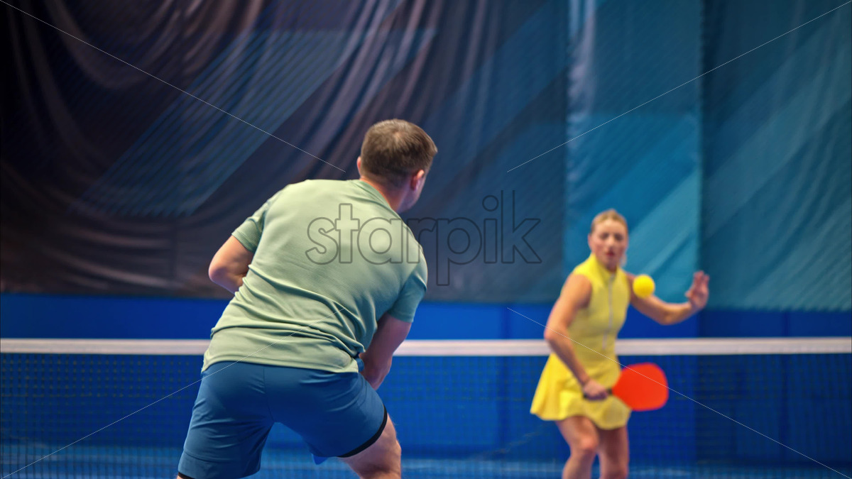 Video A man and a woman playing pickleball on a blue, inside court Royalty Free Stock Video Footage