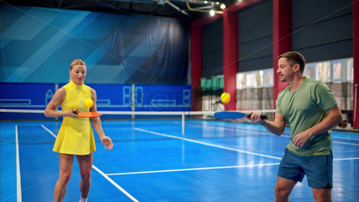 Video A man and a woman training to play pickleball on a blue, inside court Royalty Free Stock Video Footage