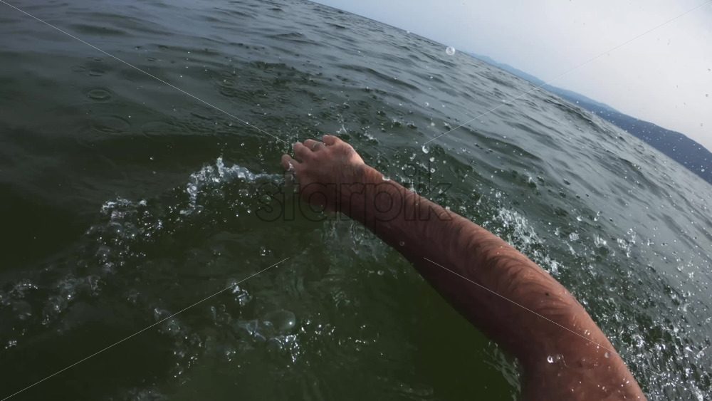 A man swimming in the dark water of a sea. Cloudy sky. First-person view, slow motion Royalty Free Stock Video Footage
