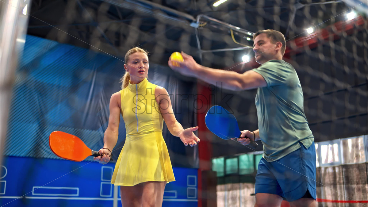 Video A man teaching a woman how to play pickleball in an inside court Royalty Free Stock Video Footage