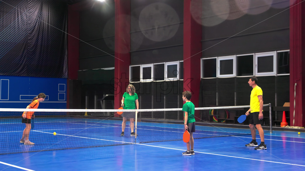 Video A boy and a girl playing pickleball on a blue, inside court Royalty Free Stock Video Footage