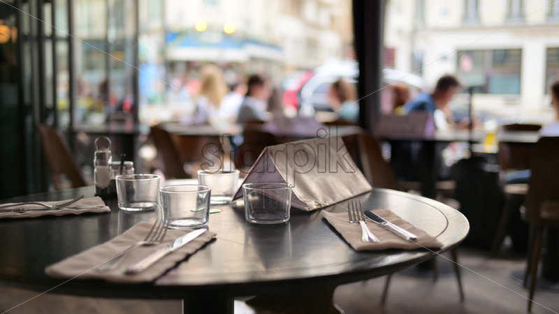 VIDEO A table set at a restaurant in Paris, France, with blurred people eating on the background Royalty Free Stock Video Footage