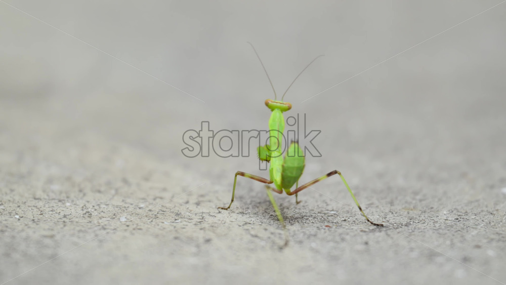 A vibrant green praying mantis moves gracefully across a grey surface. The insect showcases its unique features and alertness as it explores its surroundings. Royalty Free Stock Video Footage