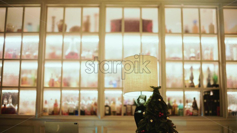 A warmly lit interior featuring large window like shelves filled with bottles Royalty Free Stock Video Footage