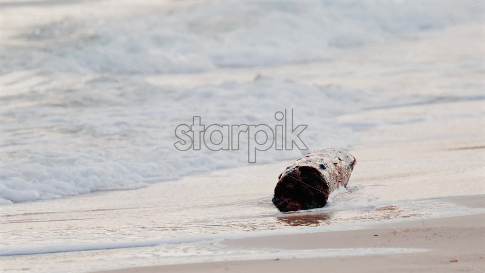 A weathered piece of driftwood gently washed by sea waves on a sandy beach in Golfe Juan, France Royalty Free Stock Video Footage