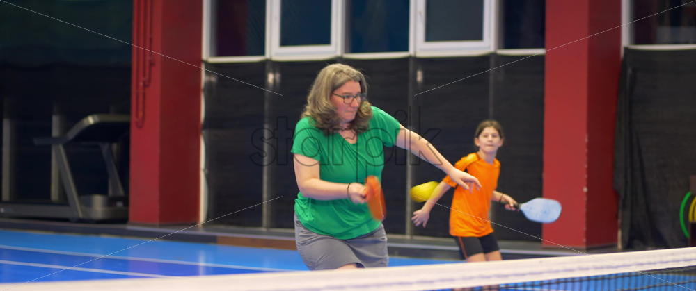 Video A woman and a child playing pickleball on a blue, inside court Royalty Free Stock Video Footage
