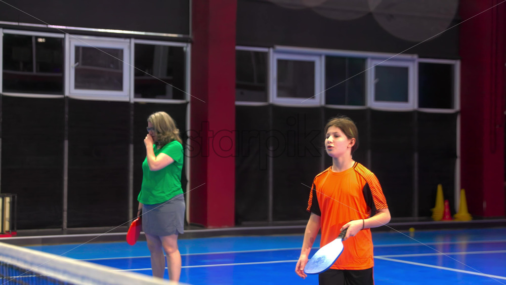 Video A boy and a girl playing pickleball on a blue, inside court Royalty Free Stock Video Footage