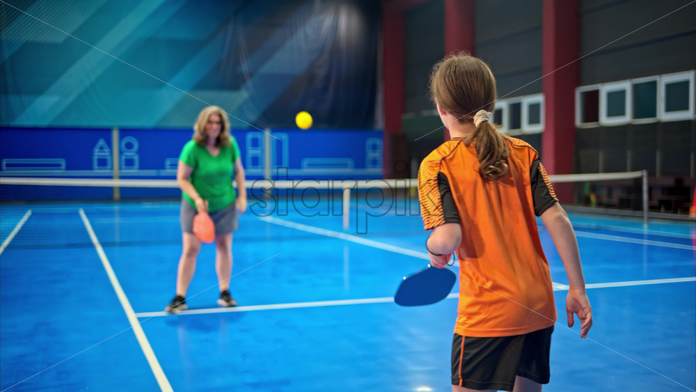 Video A woman and a child playing pickleball on a blue, inside court Royalty Free Stock Video Footage