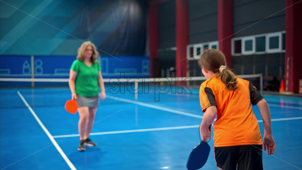 Video A woman and a child training to play pickleball on a blue, inside court Royalty Free Stock Video Footage