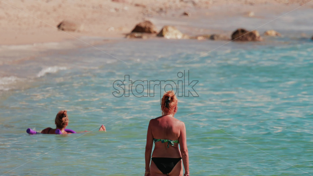 A woman in a bikini walks slowly into the clear turquoise water along a sandy beach under the sun Royalty Free Stock Video Footage