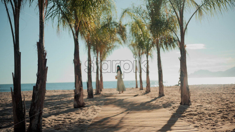 A woman in a light summer dress walks barefoot along a palm lined path toward the sea Royalty Free Stock Video Footage