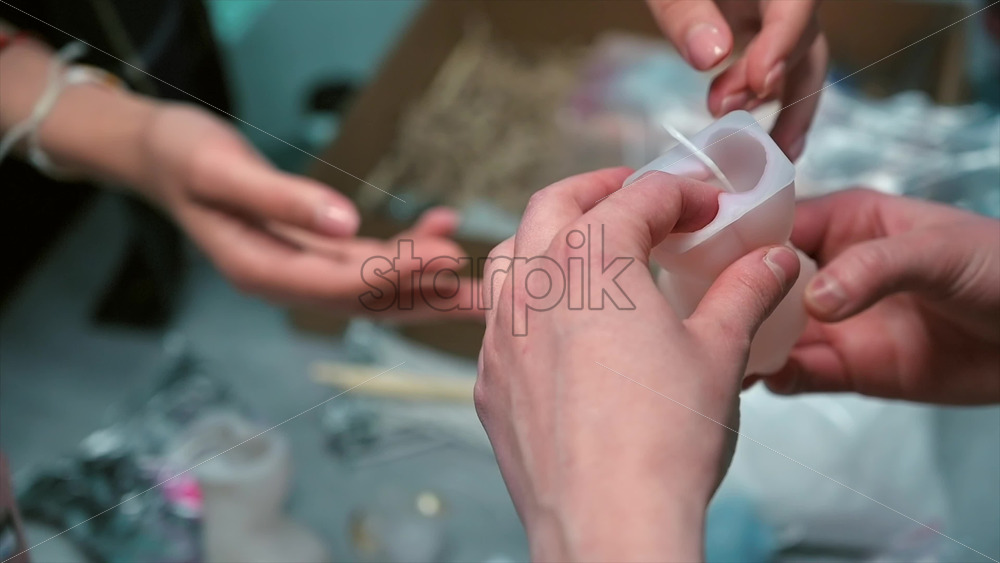 Home » Shop » 1 Video » Video – A woman occupied with hand made candles production, preparing a mold for wax. Slow motion