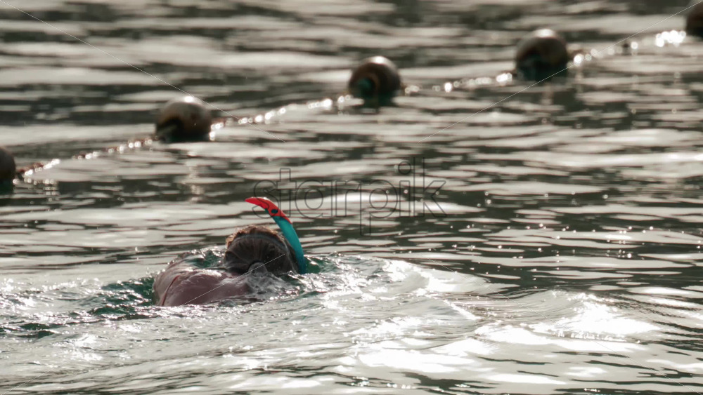 A swimmer with a snorkel glides calmly through the sea near a line of floating buoys Royalty Free Stock Video Footage