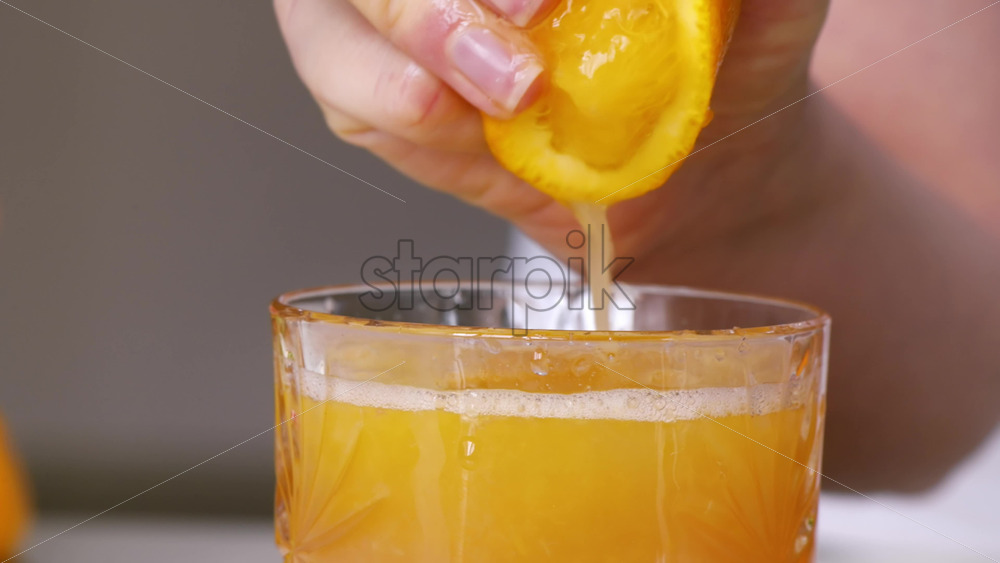 A woman squeezes juice from an orange into a glass. Slow motion Royalty Free Stock Video Footage