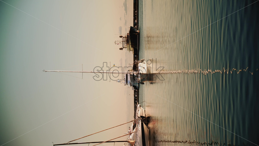 Abstract composition of sailboats and masts reflected on still water during sunset, creating symmetrical and tranquil patterns. Vertical Royalty Free Stock Video Footage