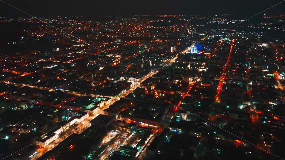 Aerial drone view of a downtown roundabout intersection with moving traffic. Illuminated Bucharest in the night. Romania Royalty Free Stock Video Footage