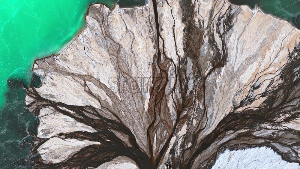 Home » Shop » 1 Video » Video – Aerial drone view a mineral lake with bright turquoise water meeting textured white sediment