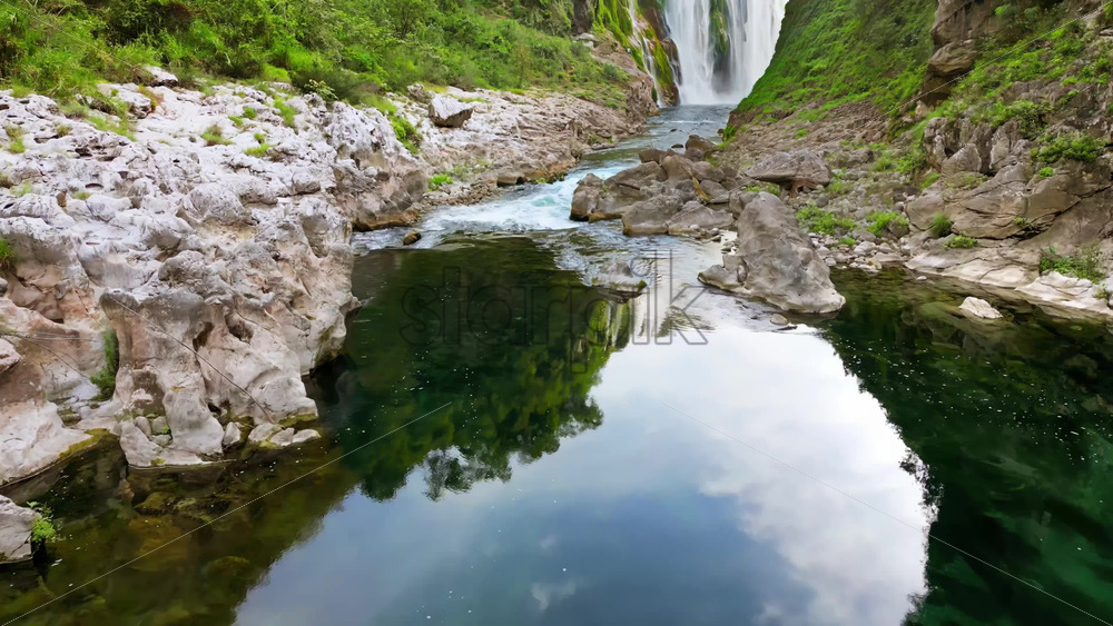 Aerial drone view a waterfall plunging into a crystal clear pool, surrounded by rocky cliffs and lush greenery Royalty Free Stock Video Footage