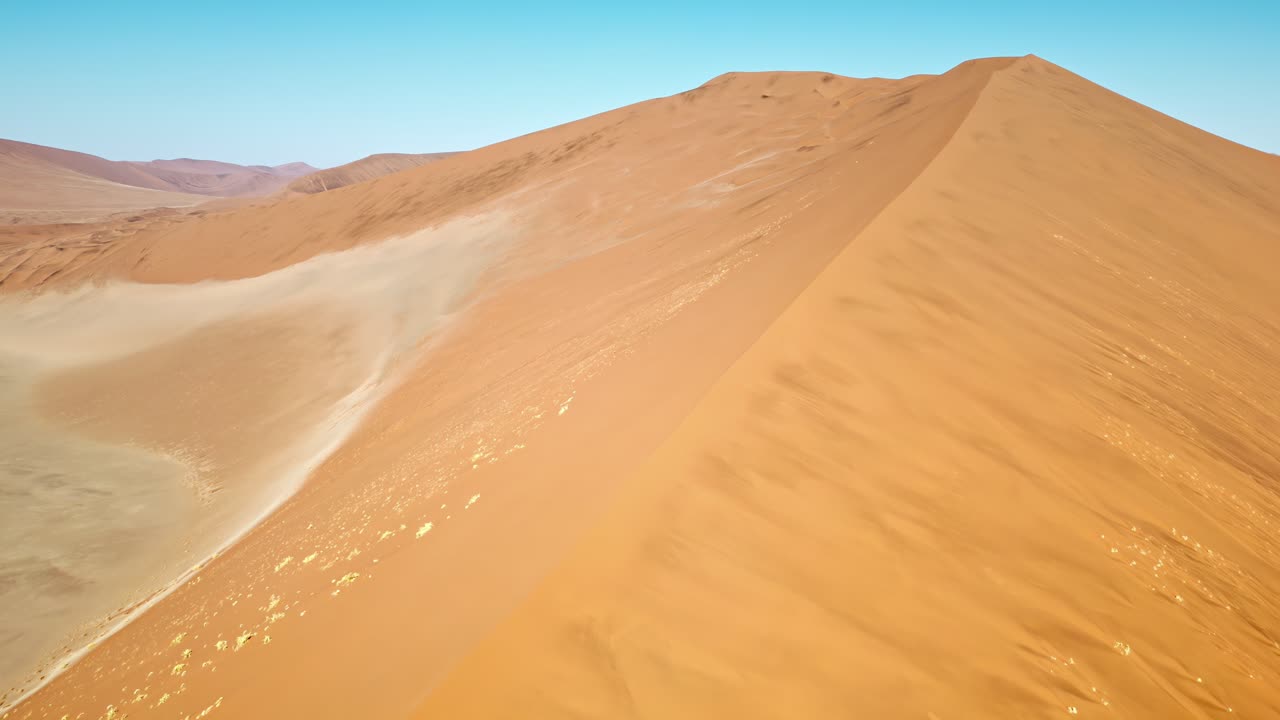 Aerial drone view along the ridge of a massive sand dune in the Namib Desert with smooth wind shaped patterns and golden desert landscape Royalty Free Stock Video Footage
