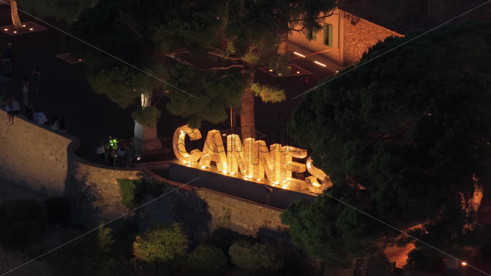 Aerial drone view illuminated “Cannes” sign in Le Suquet at night, surrounded by trees and evening visitors, creating a cinematic and iconic atmosphere, Cannes, France Royalty Free Stock Video Footage