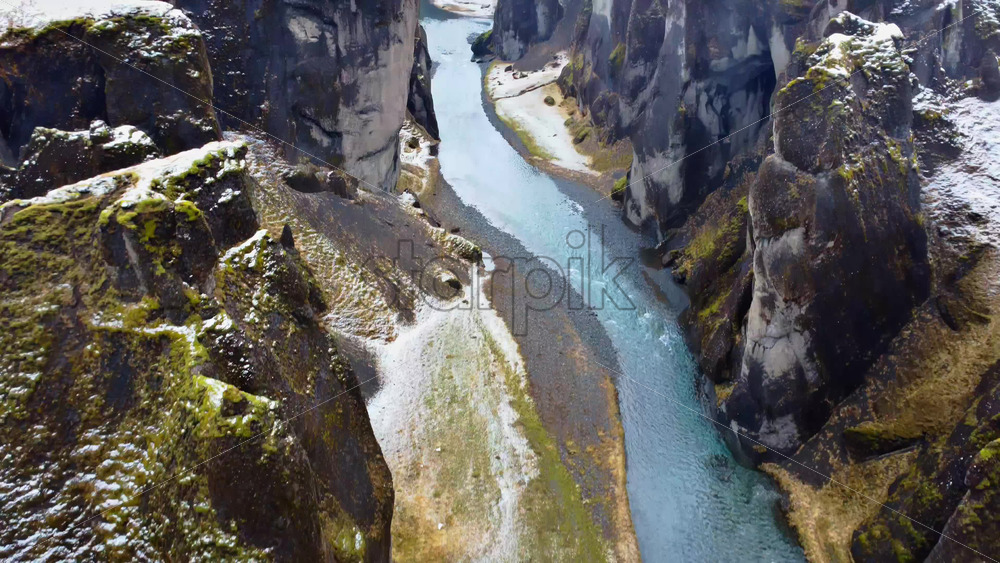 Aerial drone view looking straight down at the turquoise river winding through the dramatic cliffs of Fjaorargljufur Canyon Royalty Free Stock Video Footage