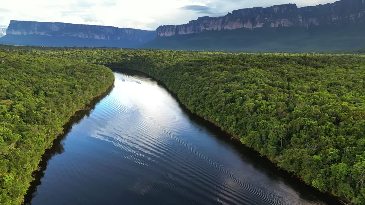 Aerial drone view of a boat moving along a dark rainforest river surrounded by dense tropical jungle in Venezuela Royalty Free Stock Video Footage
