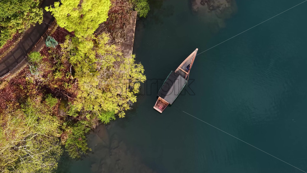 video Aerial drone view of a boat moving on the Katsura River in Arashiyama, Japan in daylight Royalty Free Stock Video Footage