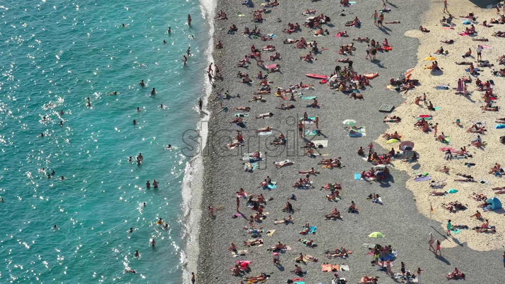 Aerial drone view of a busy section of Nice beach with umbrellas, swimmers, and promenade walkway, Nice, France Royalty Free Stock Video Footage