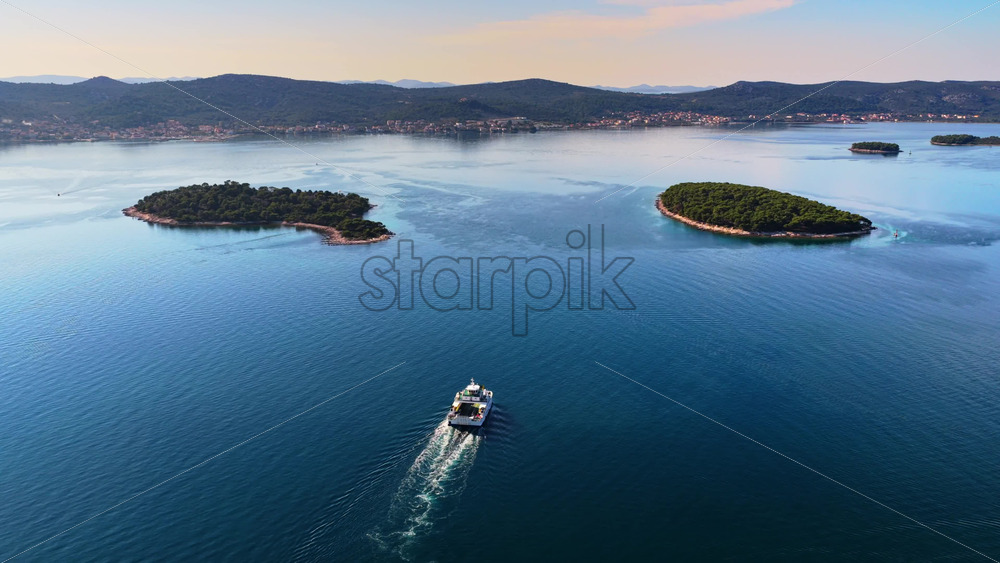 Aerial drone view of a white passenger yacht cruising through smooth blue water, framed by forested islands and hills. Biograd na Moru, Croatia Royalty Free Stock Video Footage