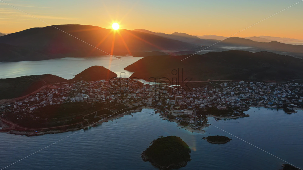 Aerial drone view of a fisherman rowing through deep turquoise waters along the Ksamil, Albania coastline, with nets and equipment visible on the rustic boat Royalty Free Stock Video Footage