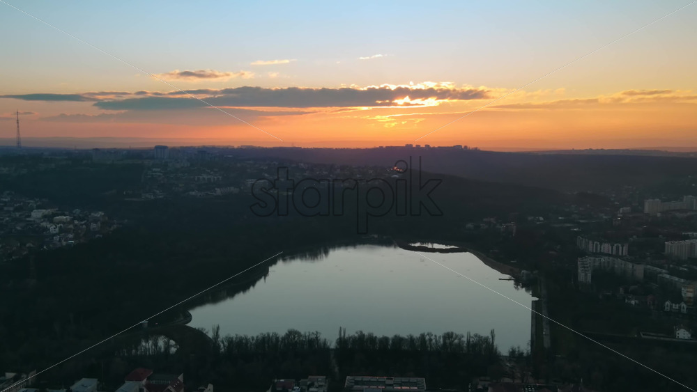 Aerial drone view of a lake in Chisinau at sunset. Panorama view of park with lake, hills and multiple buildings. Moldova Royalty Free Stock Video Footage Royalty Free Stock Video Footage