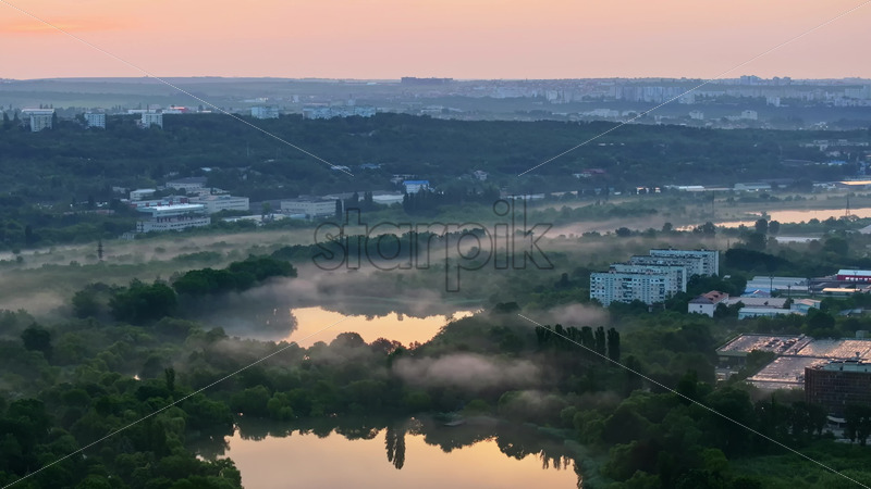 VIDEO Aerial drone view of a lake surrounded by trees in Chisinau, Moldova at sunrise Royalty Free Stock Video Footage