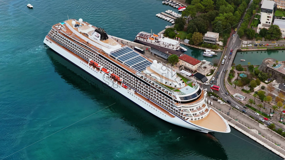 Aerial drone view of a large cruise ship docked at the Kotor port, with buses, marina, and waterfront infrastructure visible Royalty Free Stock Video Footage