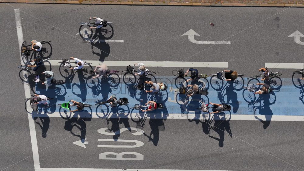 Aerial drone view of a large group of cyclists waiting at a traffic light in Copenhagen, Denmark Royalty Free Stock Video Footage