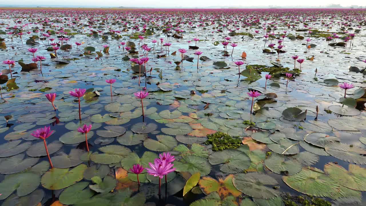 Aerial drone view of a large lake covered with blooming pink lotus flowers and lily pads Royalty Free Stock Video Footage