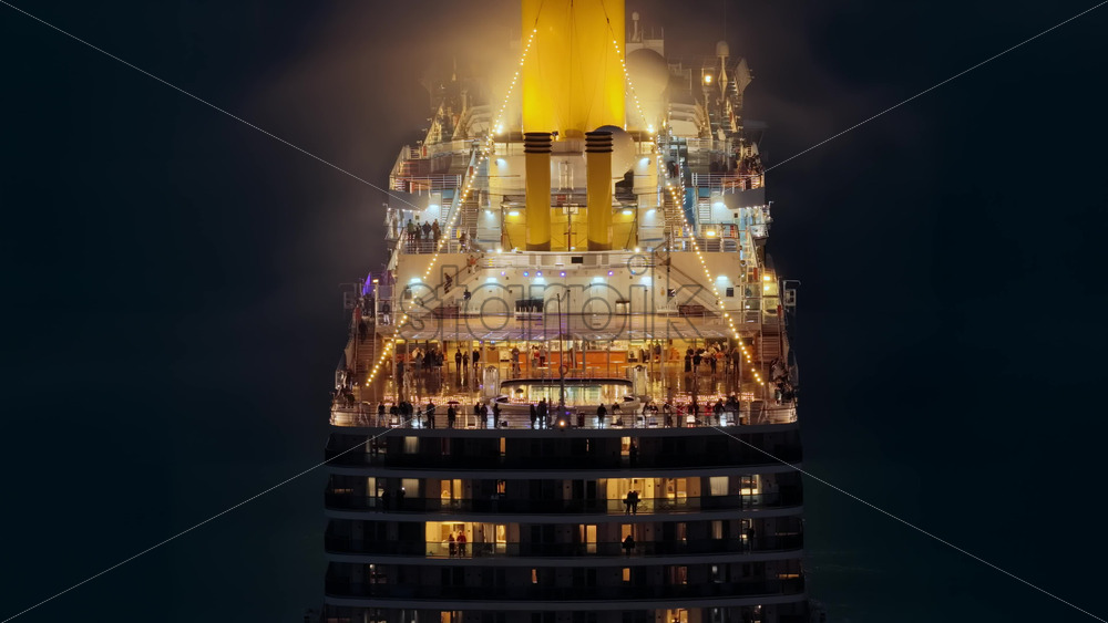 Aerial drone view of a massive cruise ship, brightly lit with warm lights, as passengers enjoy its outdoor decks at night Royalty Free Stock Video Footage