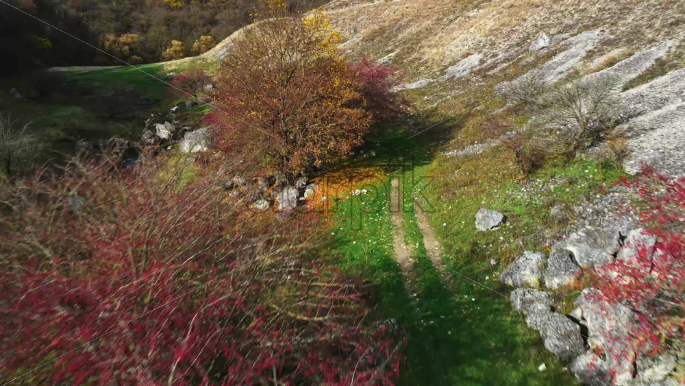 Aerial drone view of a narrow Moldovan valley with red autumn bushes, rocky slopes, and a winding green path Royalty Free Stock Video Footage