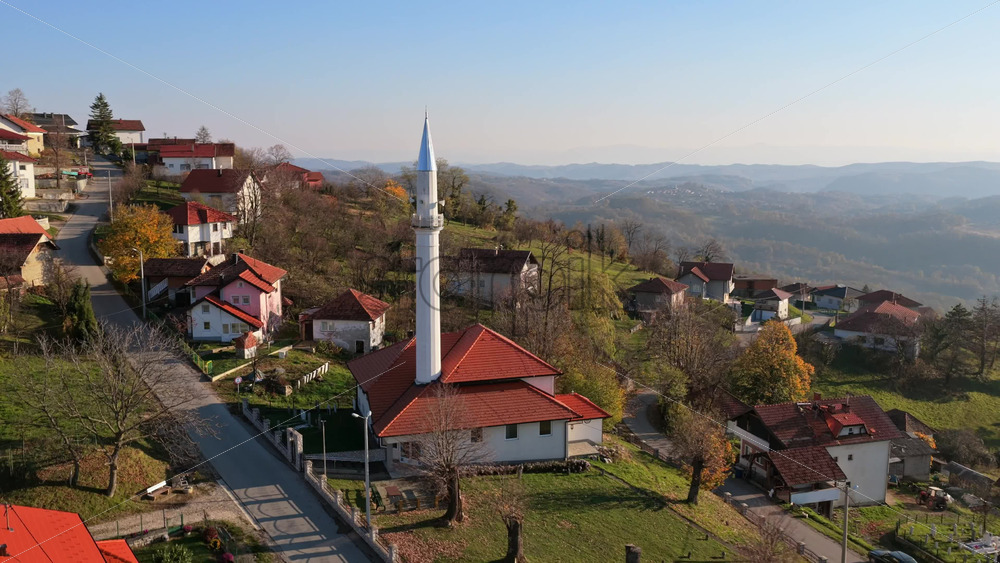 Home » Shop » 1 Video » Video – Aerial drone view of a picturesque hillside village featuring red roofed houses and a tall white mosque minaret, surrounded by open fields and distant mountain ranges in Bosnia and Herzegovina