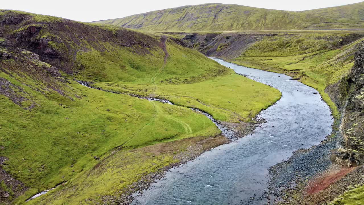Aerial drone view of a river winding through a narrow canyon surrounded by grassy volcanic hills and rugged cliffs in the Icelandic countryside Royalty Free Stock Video Footage