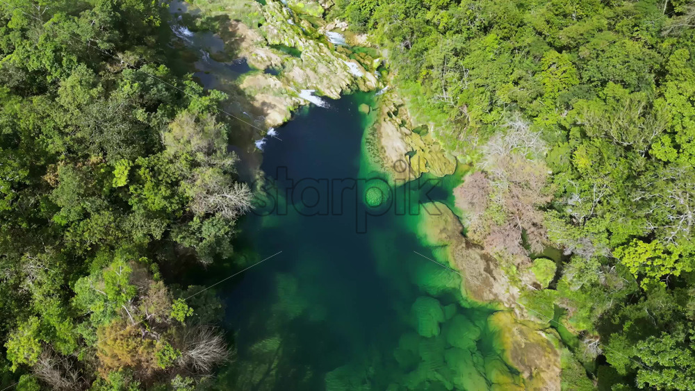 Aerial drone view showing a waterfall flowing into a deep blue basin surrounded by rock formations and vegetation Royalty Free Stock Video Footage