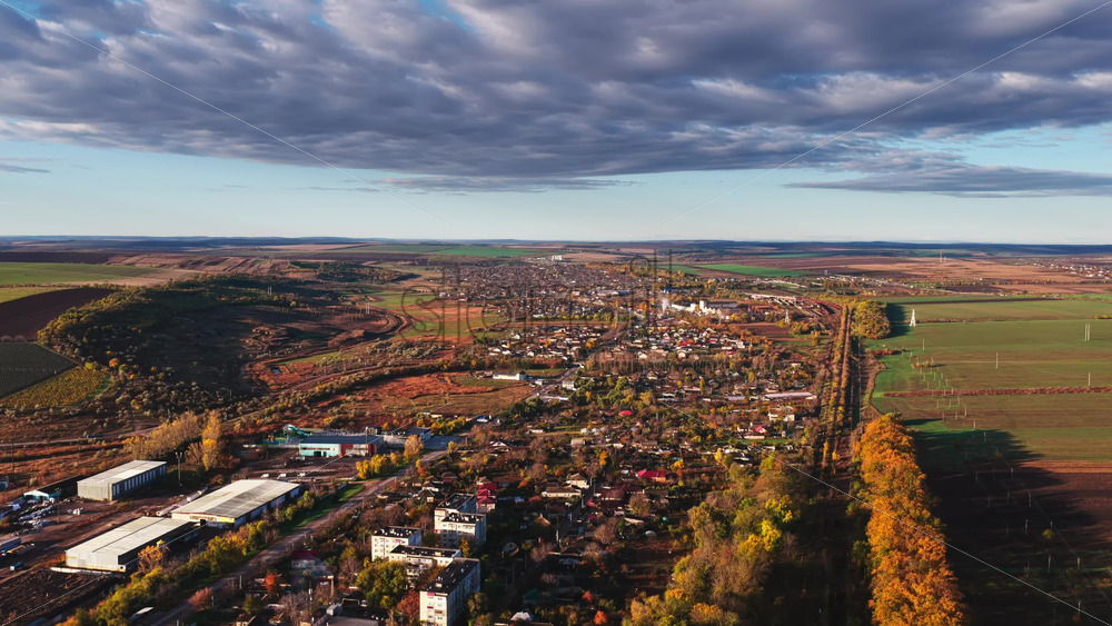 Aerial drone view of a Moldovan village surrounded by autumn trees and farmlands during sunset Royalty Free Stock Video Footage